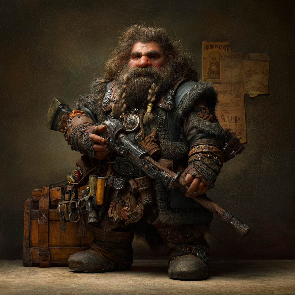 Race: Dwarf (raised by giants) Class: Bounty hunter Goal: Unclear - gambling seems to be his main drive